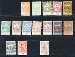 1908, 1 F. To 5 Kr. Postal stamps imperforated mint never hinged, 16 values, mostly from upper- or lower margin, also a corner of the sheet, unsigned and perfect, very rareLive Auction